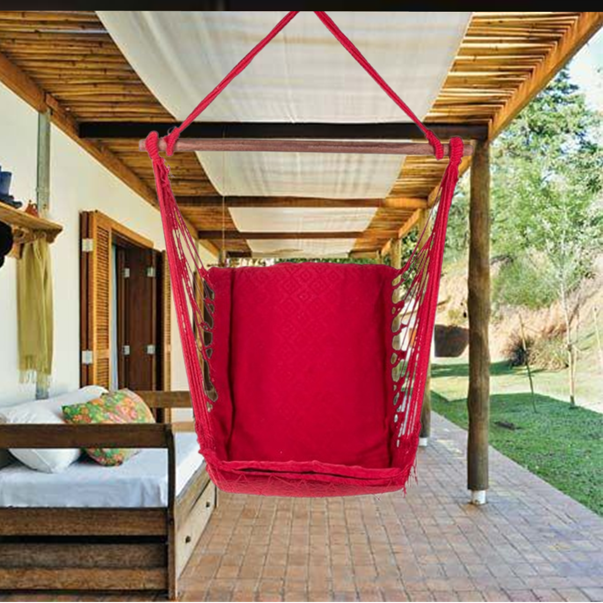 A rede cadeira foi criada a partir dos tecidos da rede tradicional, entre duas camadas de tecidos colocamos espumas no assento e no encosto.